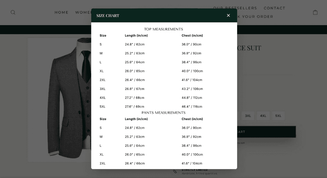 We make it easy to have great size chart that helps you on your backend. Other apps you still have to use HTML codes or insert the dimensions manually. Here simply upload the chart straight from your supplier and it's done.