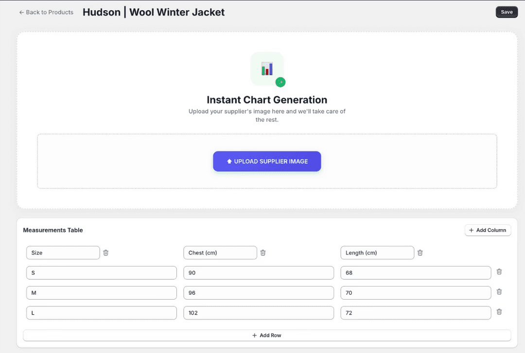 Direct real-time upload of supplier size chart images, perfectly framed for your store's design.